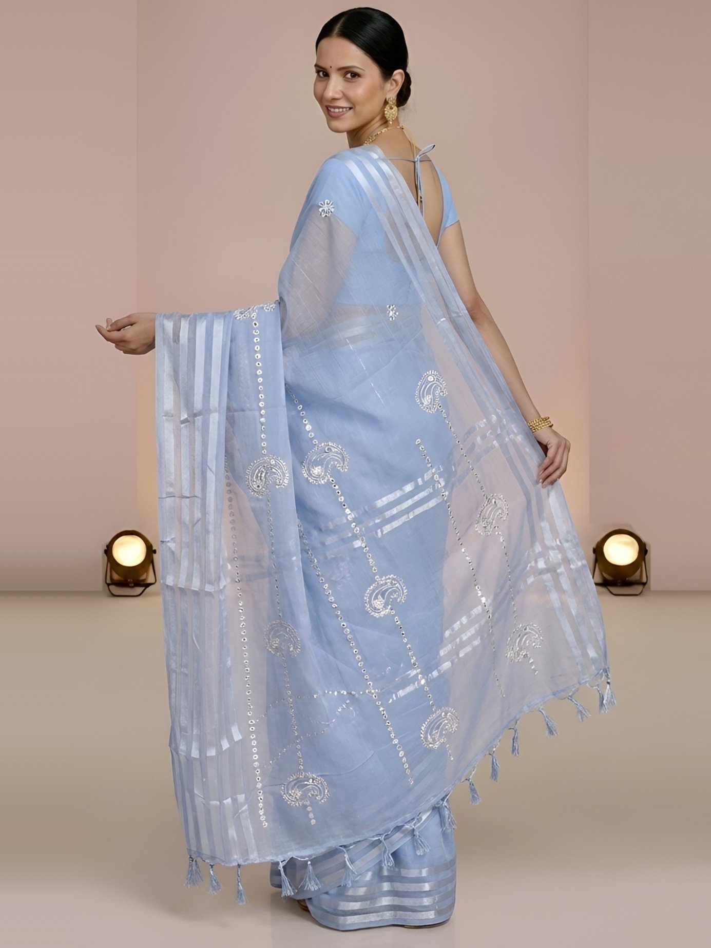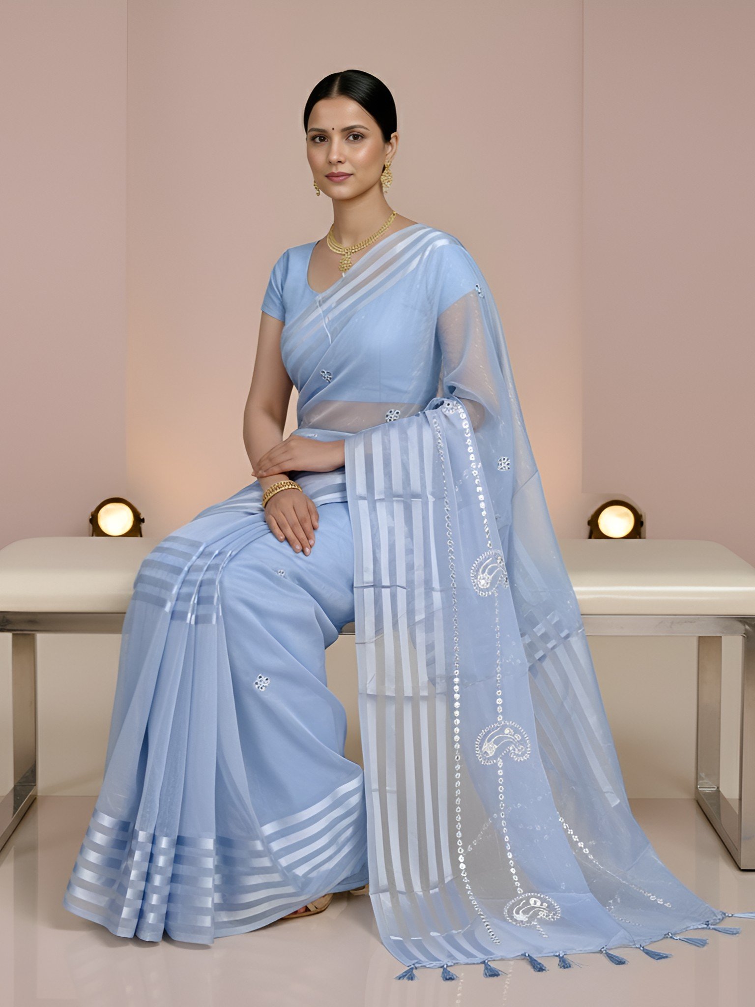 The lightweight, breathable chiffon ensures comfort for long hours and easy movement; its gentle sheen catches light without overwhelming the outfit, making it perfect as a daily wear chiffon saree, yet polished enough for informal parties or meetups.