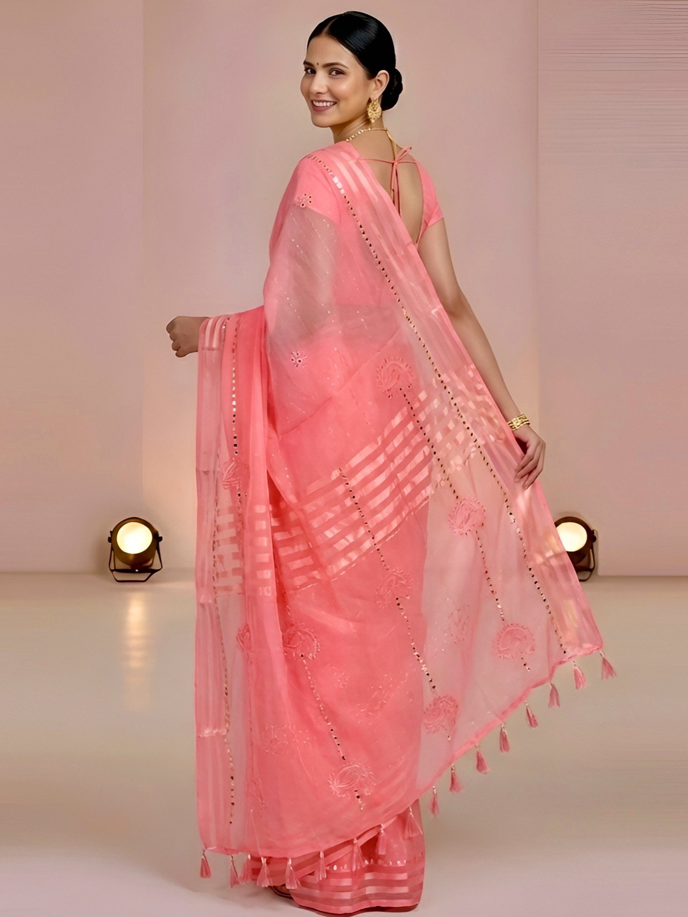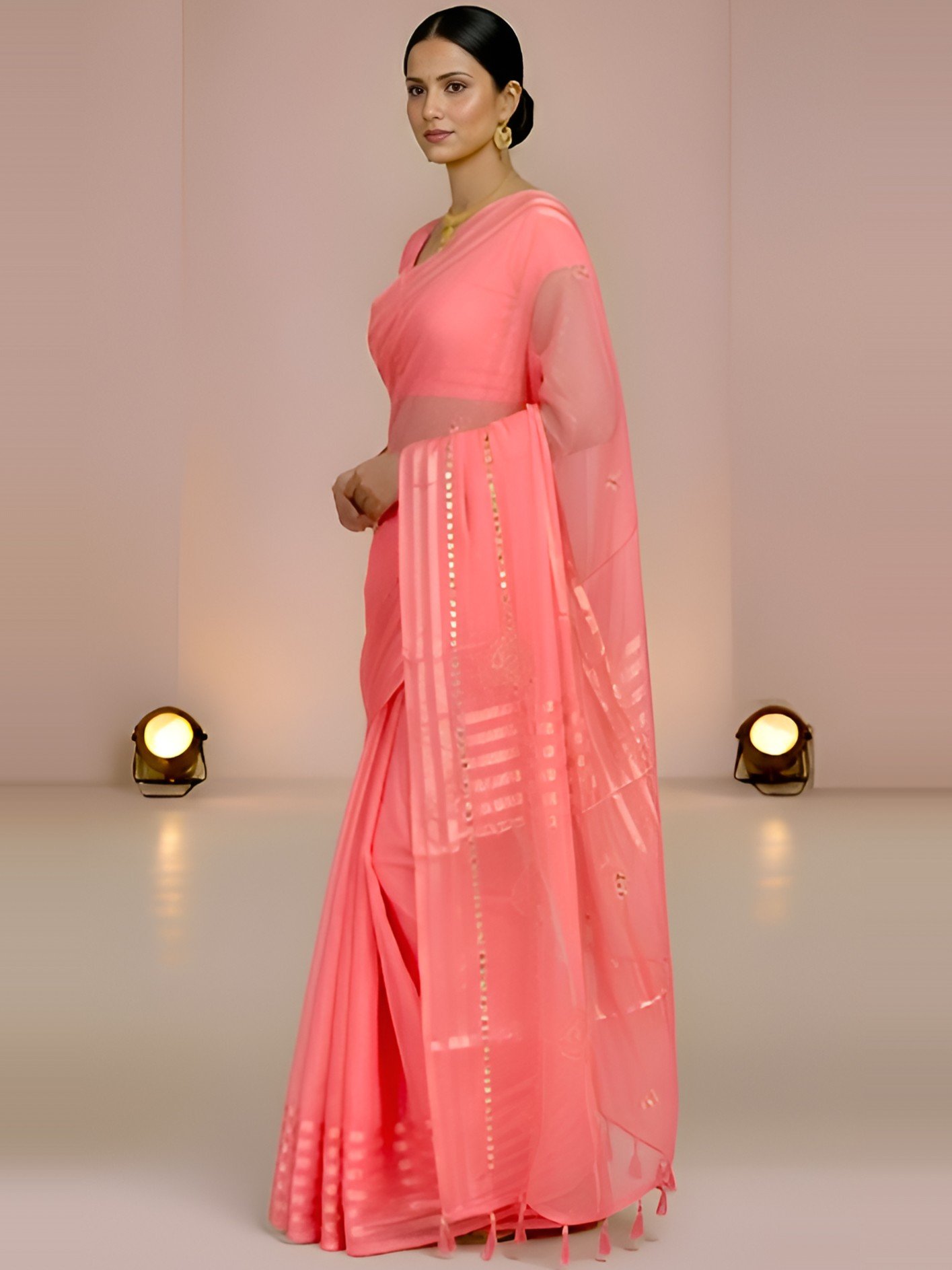 The lightweight, breathable chiffon ensures comfort for long hours and easy movement; its gentle sheen catches light without overwhelming the outfit, making it perfect as a daily wear chiffon saree, yet polished enough for informal parties or meetups.