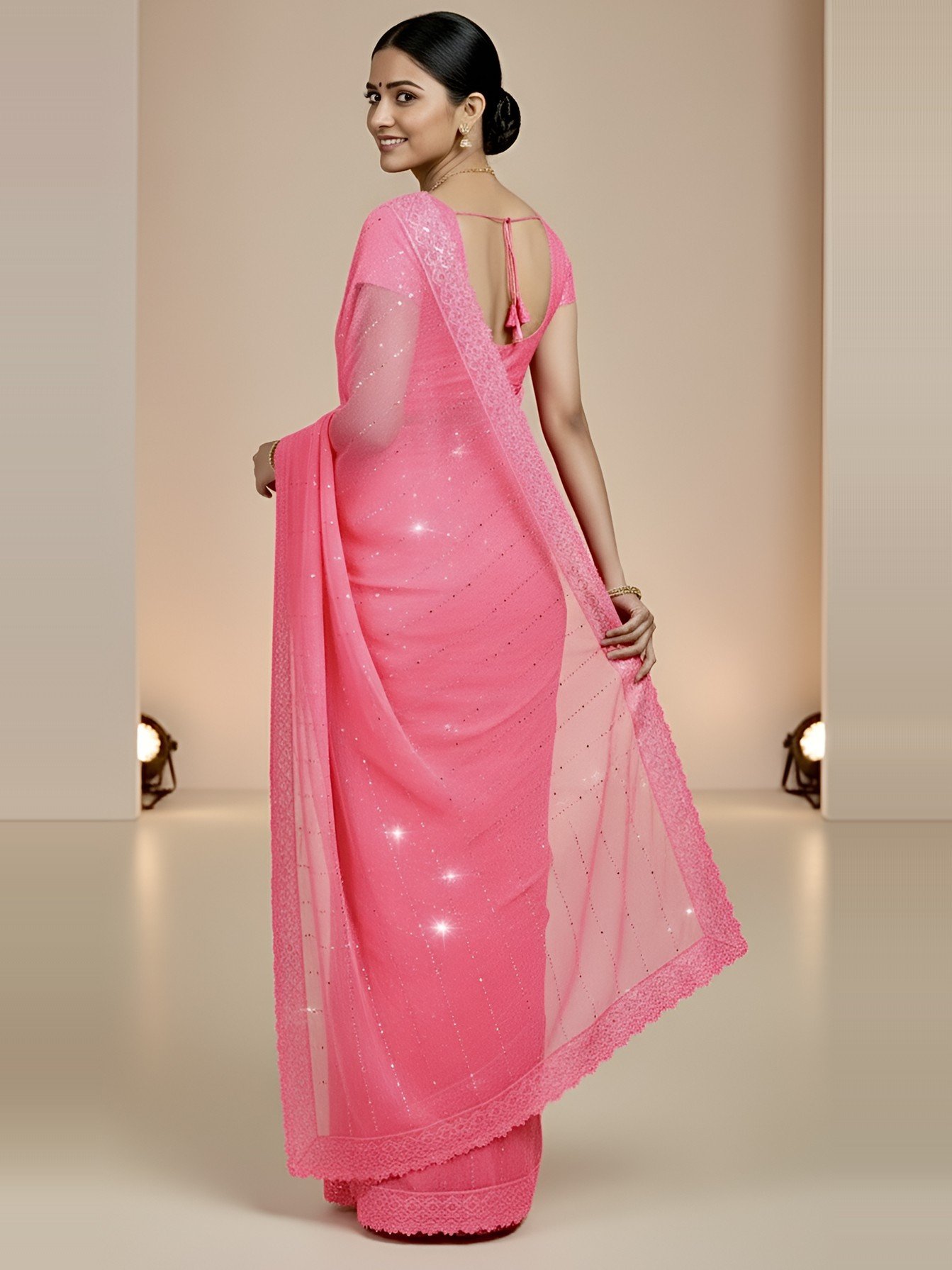 0 reviews for RAjLUXE Mid-Night Rose Net Shimmer Party Wear Saree with Blouse Piece (Pink)