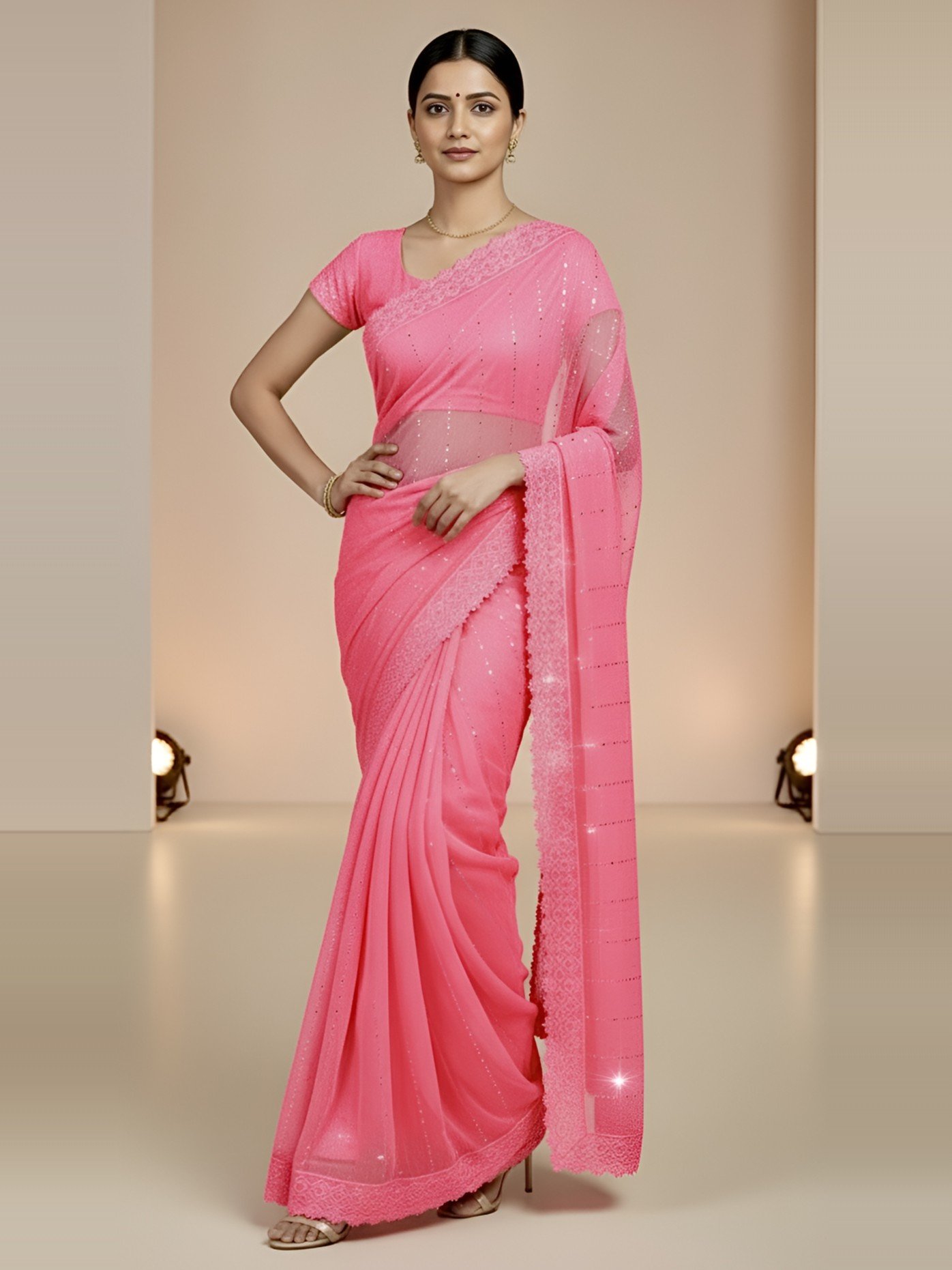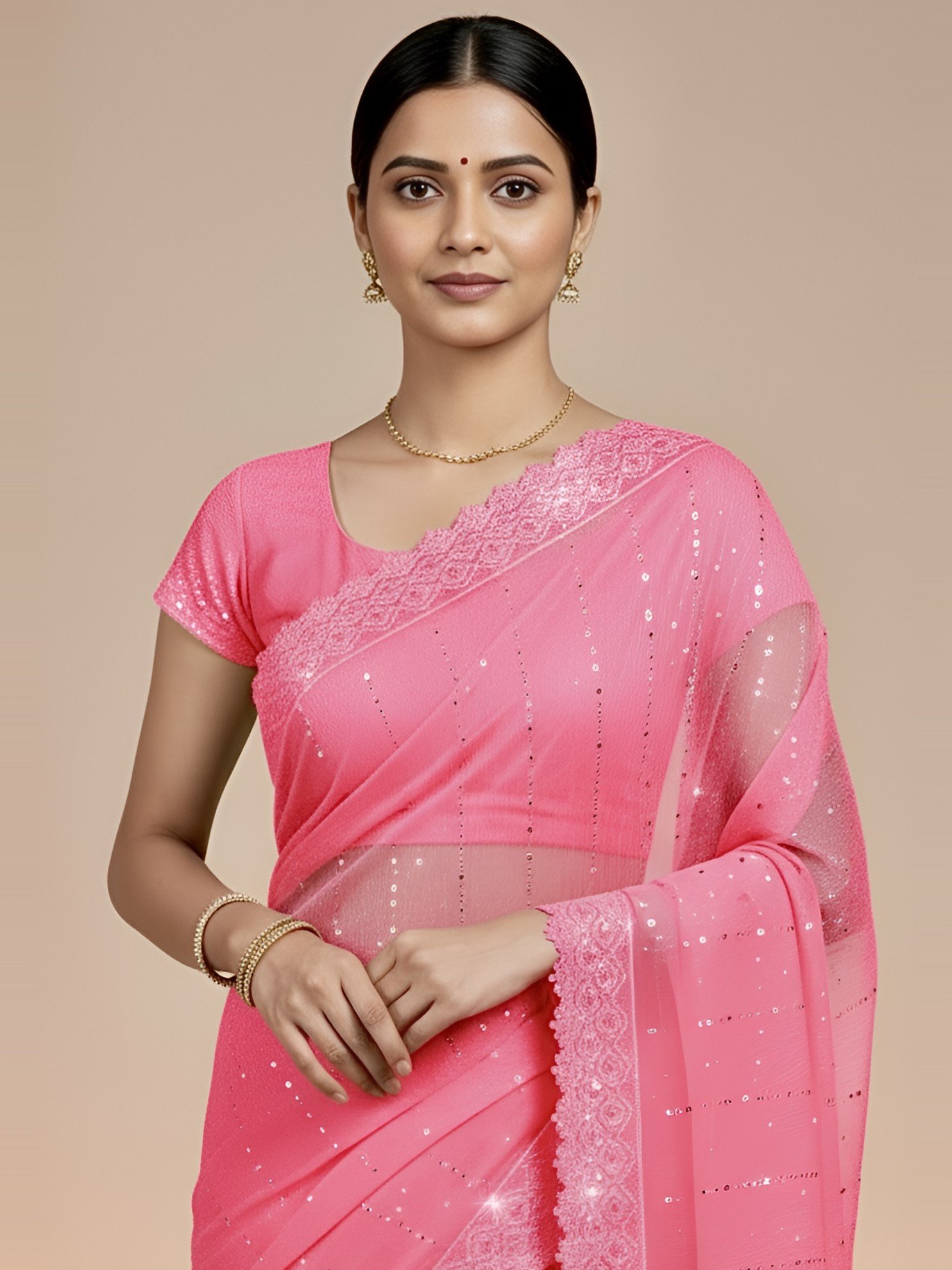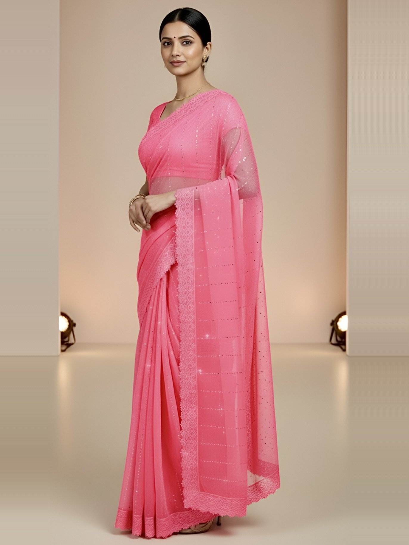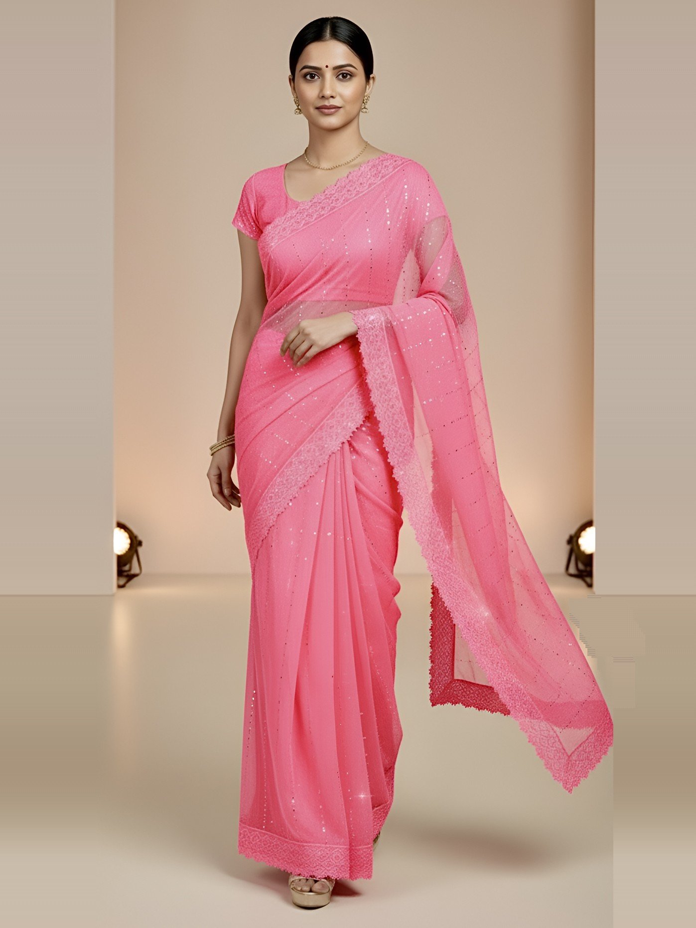 RAjLUXE Mid-Night Rose Net Shimmer Party Wear Saree with Blouse Piece (Pink)